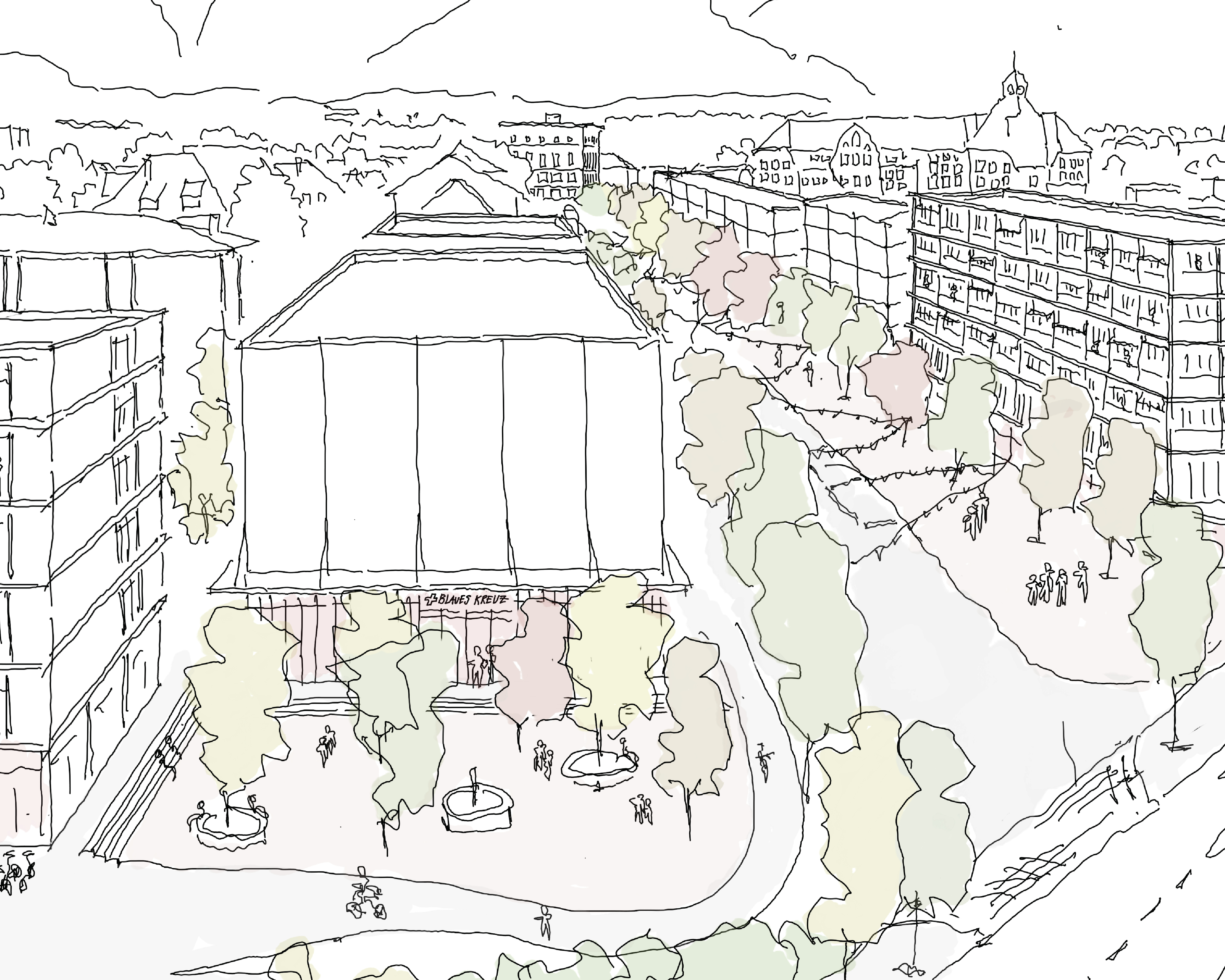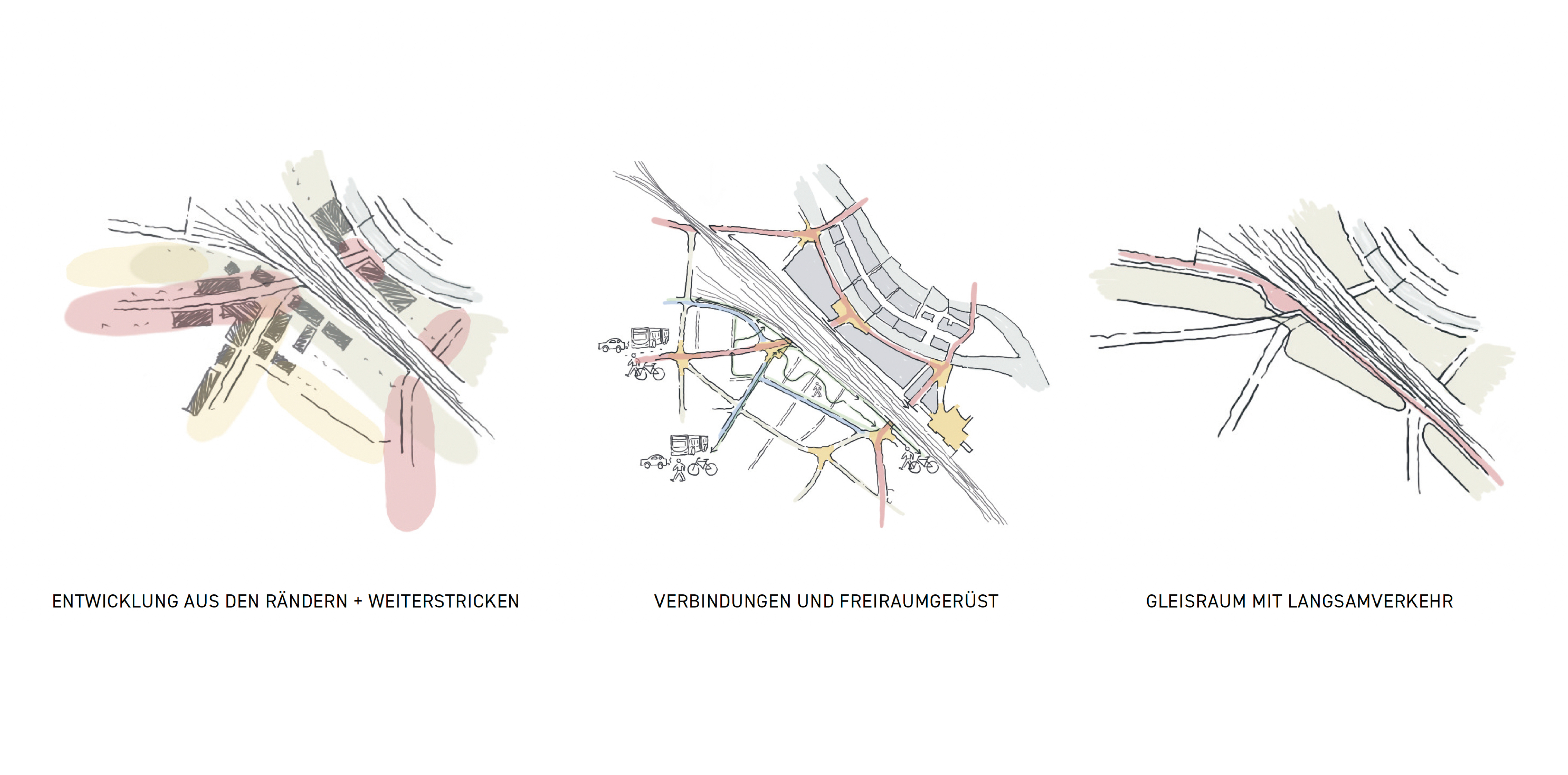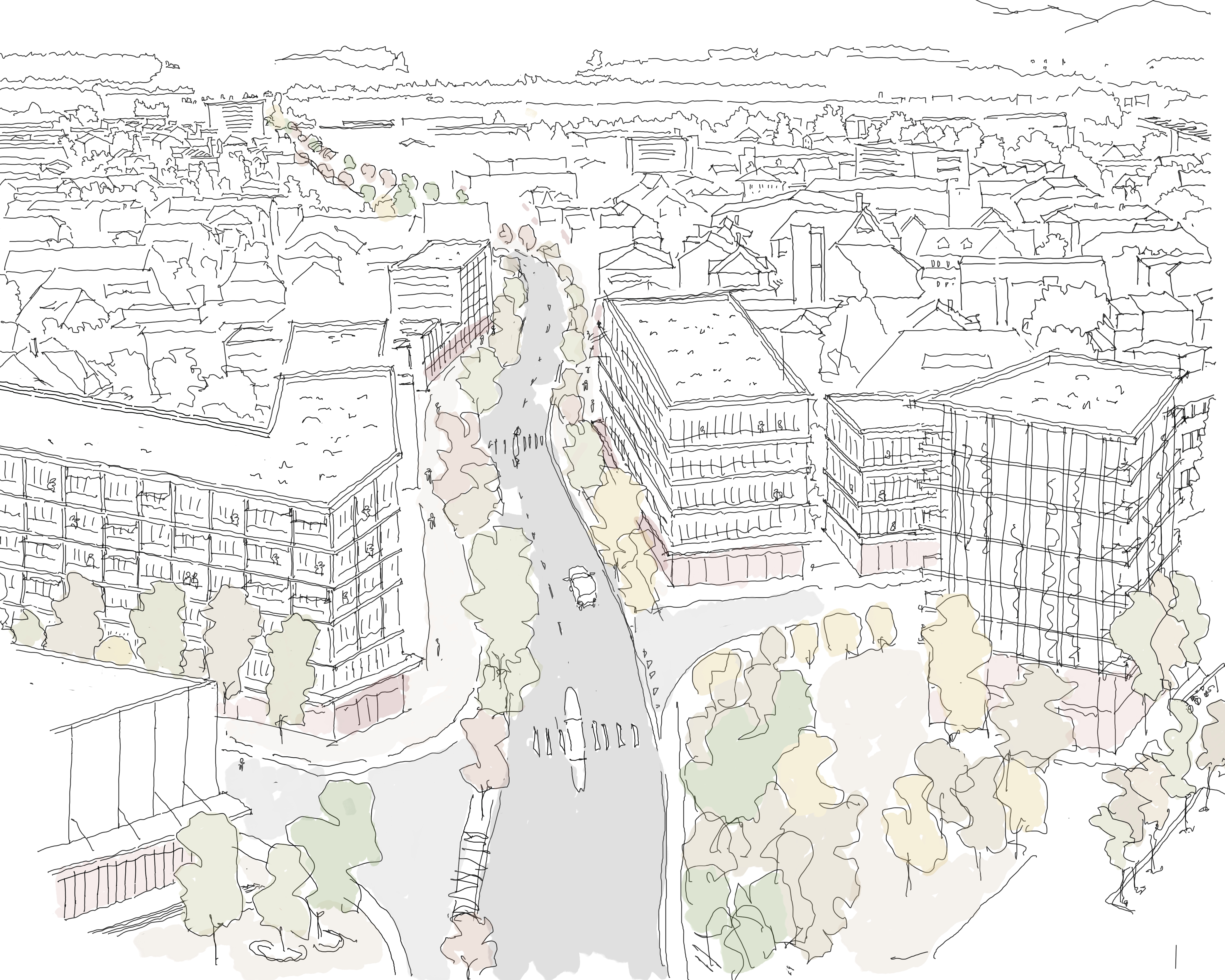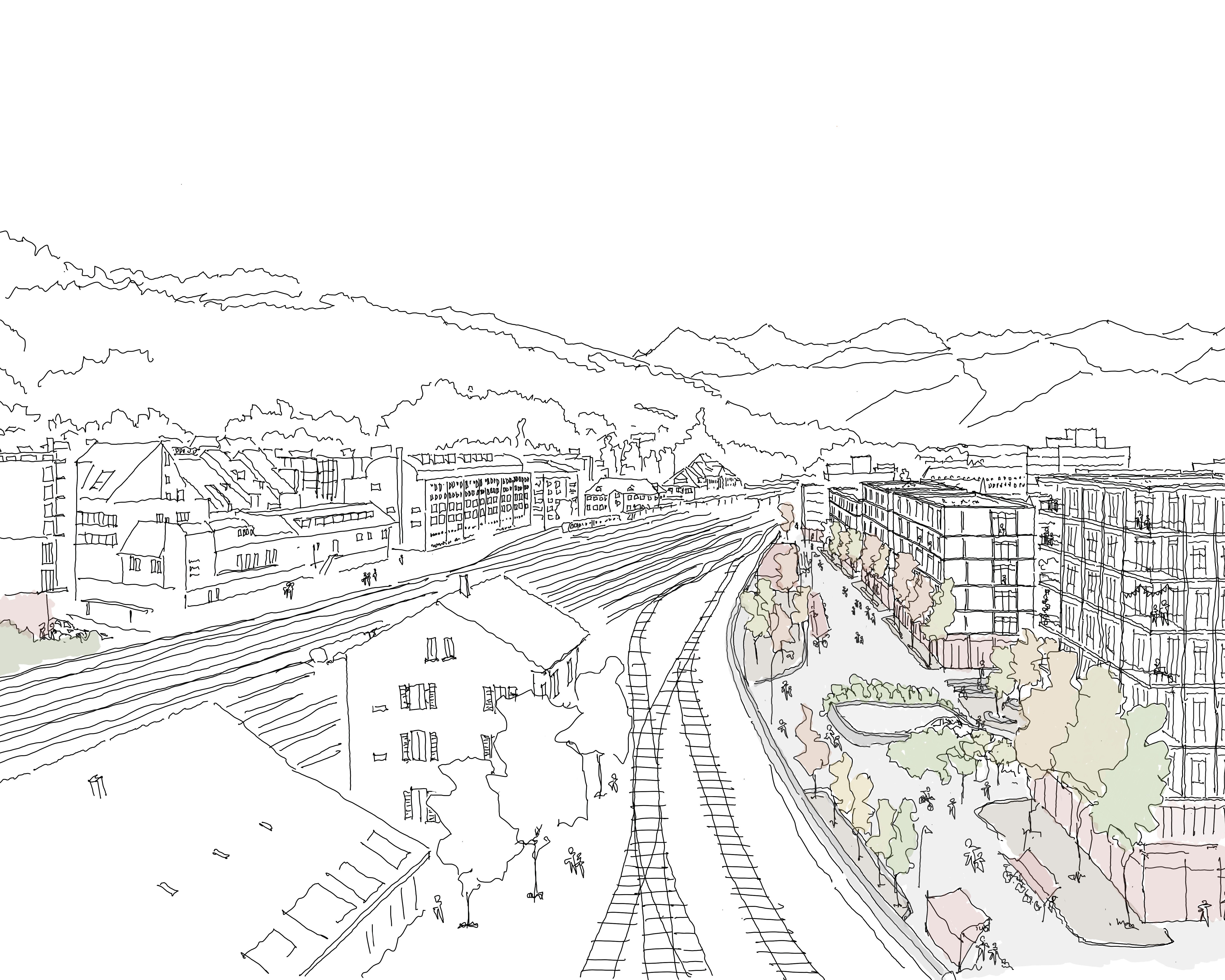 Entlang der Gleise und der Mittleren Strasse wird verdichtet – mit Rücksicht auf Vielfalt und bestehende Strukturen. Öffentliche Erdgeschosse mit Cafés, Läden und sozialen Angeboten schaffen lebendige Treffpunkte. Die Mittlere Strasse soll sich dabei zu einer neuen Verkehrsachse mit wirtschaftlichem Potenzial entwickeln und somit die Pestalozzistrasse entlasten.